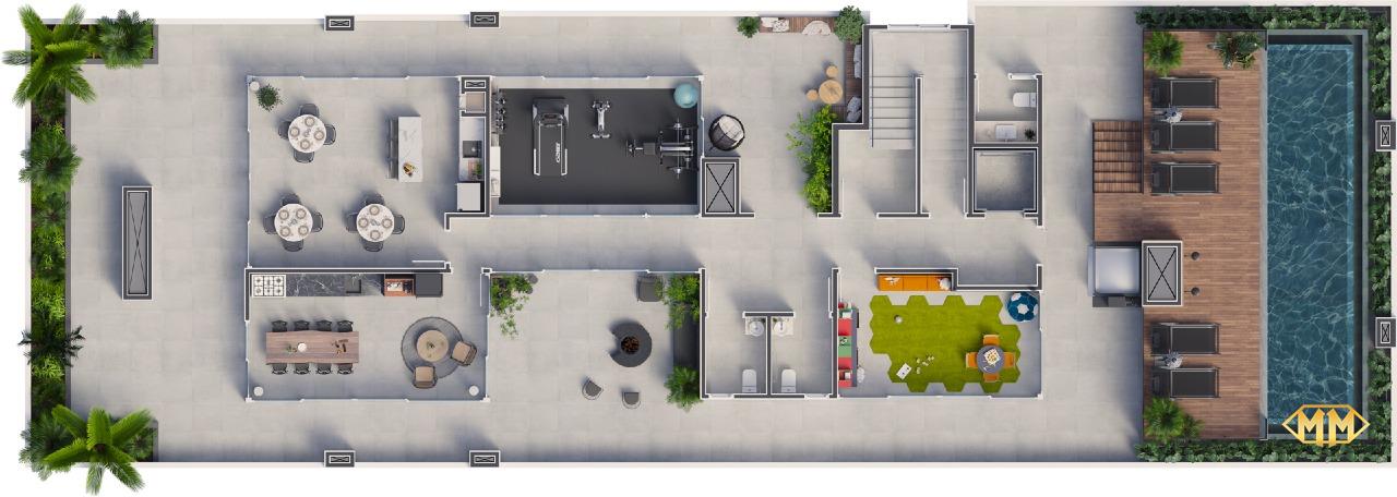 As áreas de lazer estarão dispostas no rooftop, com piscina adulto e infantil com borda infinita, brinquedoteca, academia, salão de festas com churrasqueira e espaço gourmet com Wine Bar e lounges externos.